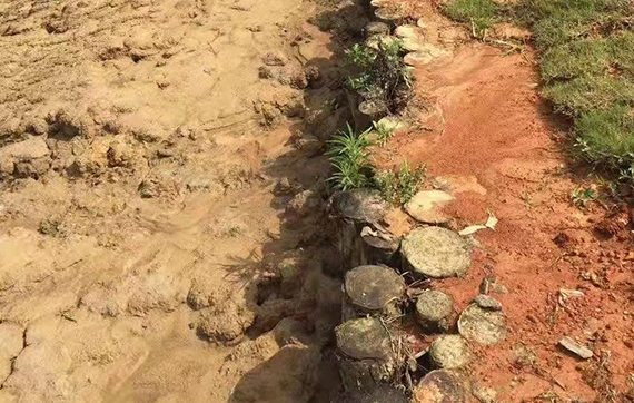 改造魚塘,堤壩用木樁加固為了穩(wěn)定壩的基礎(chǔ),兩邊用松木樁固定;相對(duì)來說木樁成本較低。